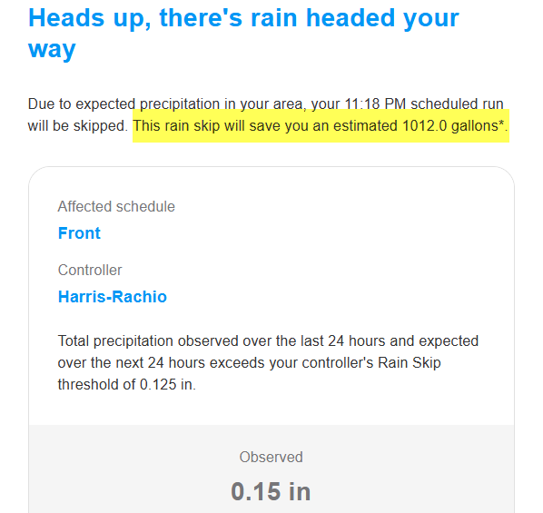 When I get a notice that a planned watering was skipped due to rain how is it possible I saved over 1000 gallons from that one skip?
