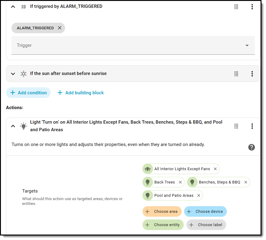 I have another HA automation that turns on the landscape lighting if our home alarm is triggered, which will happen if our back yard gate is opened at night.